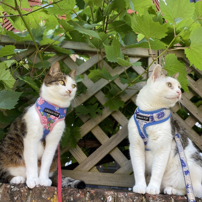 Current kitties; Ernest and Alice -indoor rescue cats, walking in their harnesses in the garden